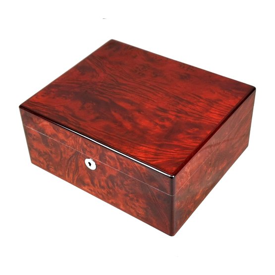 This 25 cigar humidor is made from the finest natural Makah Burl wood veneer. It has 15 coats of lacquer giving it a high gloss finish. The interior is lined in cedar. It is fitted with a chrome Hillwood hygrometer and humidifier system for perfect cigar storage. It has a removable divider to keep cigars separate and accommodate different sizes as well as a key lock to keep it closed and secure. The base is fitted with a removable wood and brass mesh frame to enable uniform airflow around the cigars in the bottom of the box. Brand new and in a gift presentation box this humidor will be great for personal use or as a gift.