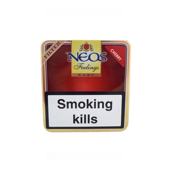 The Neos Ruby Feelings Cherry Filtered Cigars are produced from a blend of Burley and Virginia, which have been infused with rich flavours of ripe Black Cherry before being finished with the highly sort after Java Besuki wrapper, which adds even more flavour and character to these cracking miniature cigars. n nThe Neos Cherry feelings are a mild filtered cigar, which are ideal for a day time smoke or whenever the feeling arises. They do not require cutting and can be smoked straight out of the pack.