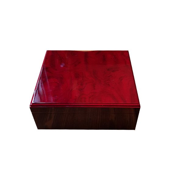 A classic red wood humidor for up to 75 of your cigars. This humidor will look fantastic in any room of your house. A deep red wood with a lacquered finish and cedar lining. n