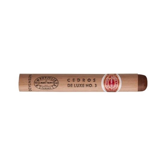 Romeo y Julieta Cedros de Luxe No. 3 is the smallest size (vitola de Galera is Marevas) of the triptych of the Cedros de Luxe family, recognizable by the application of a cedar sheet on the outside of the cigar, held in place by the band of the brand. In 2017, however, Cedros de Luxe No. 1 was discontinued, leaving No. 3 and No. 2 as the only representatives of the line. It has been in production since before the Castro revolution.